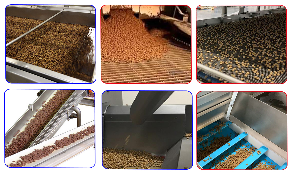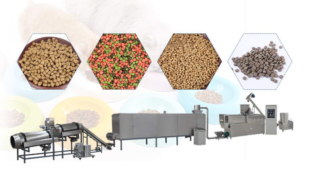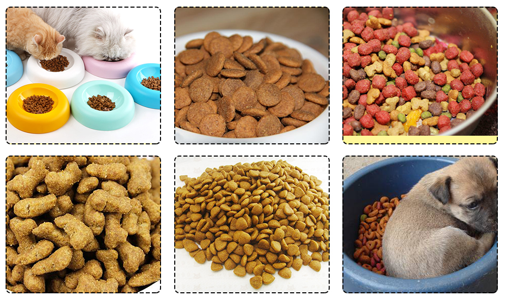 该生产线生产的猫/狗粮具有蛋白质含量高、营养全面的特点。一般谷物,如豆粕、玉米粉、碎麦、麦芽等,常用于提高产品的稠度。肉与其他成分混合。干宠物食品的保质期约为 10 至 12 个月。并可添加微量元素,促进宠物快速成长。通过模具更换辅机,可以制作出不同的宠物食品。该狗粮生产线也可用于制造其他宠物食品,如鸟食、鱼食等。