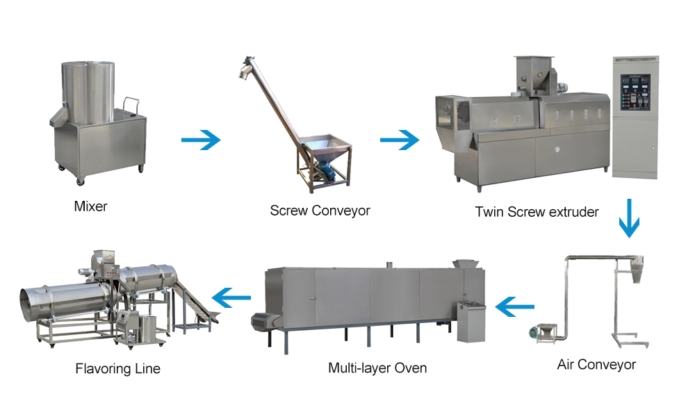 混合机→螺旋输送机→挤出机→气流输送机→干燥机→调味机→提升机→冷却机→包装机